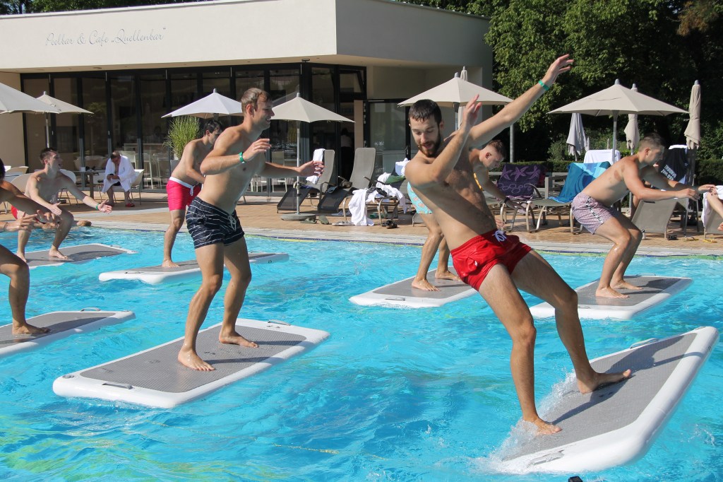 Am Samstag wartete neben zwei intensiven Trainingseinheiten das zweite Testspiel gegen die Sportunion Leoben. Stark dezimiert und das Training der letzten Tage in den Beinen setzte man sich gegen das ZTE HLA Challenge Team 34:32 durch. Anschließend ging es zurück in die Therme, wo das Abendessen mit dem wohl beliebtesten Nachtisch des Teams, dem Schokobrunnen, wartete. Anschließend ließ das Team den Tag bei einem gemeinsamen Mannschaftabend ausklingen. Nach dem Frühstück ging es am Sonntagvormittag zur FloatFit Einheit in die Therme. In zwei Durchgängen gaben die Spieler der HSG Holding Graz den staunenden Thermengästen ihr Balancegefühl und ihre Fitness auf schwimmenden Brettern zum Besten.