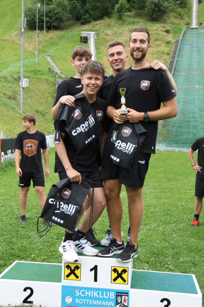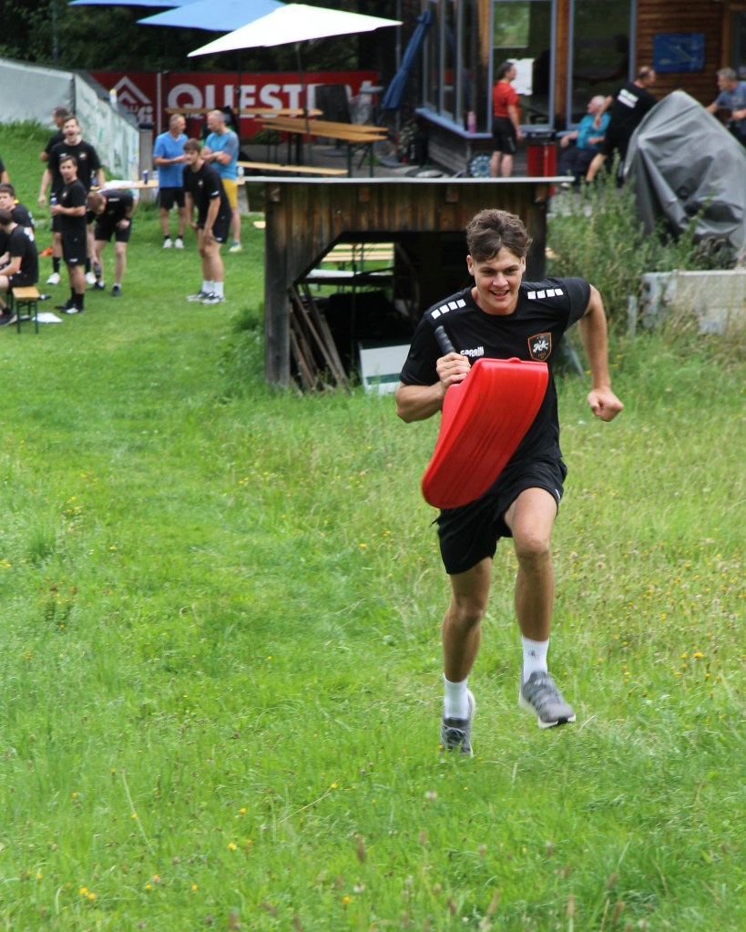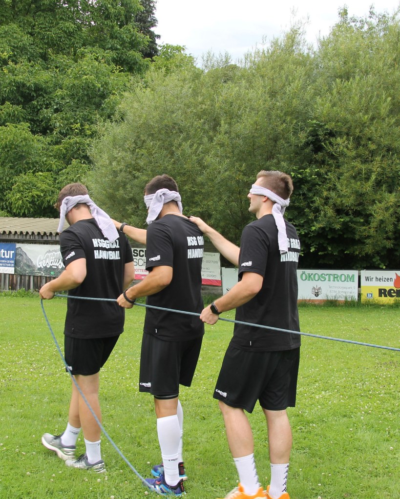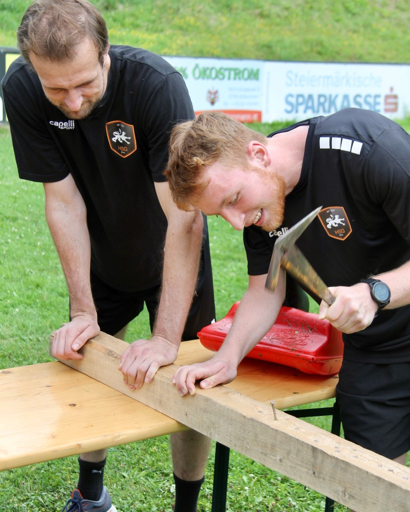 Statt dem Handball wurde der Zipfelbob am vergangenen Freitag zum Arbeitsgerät der Grazer Handballer. In Vierer-Teams absolvierten die Spieler der HSG Holding Graz eine Reihe an Challenges, bei denen es zum Abschluss immer mit einem Zipfelbob die Schisprungschanze von Rottenmann hinunter ging. Vom Staffellauf auf den Berg, blind ein Quadrat mit einer Schnur bilden, eine Tripple-Zahl auf einem Dartboard treffen bis hin zu einen Nagel in einen Baumstamm schlagen, war alles dabei. Ausklingen ließ man den Tag bei einer gemeinsamen Grillerei unmittelbar neben der Sprungschanze.