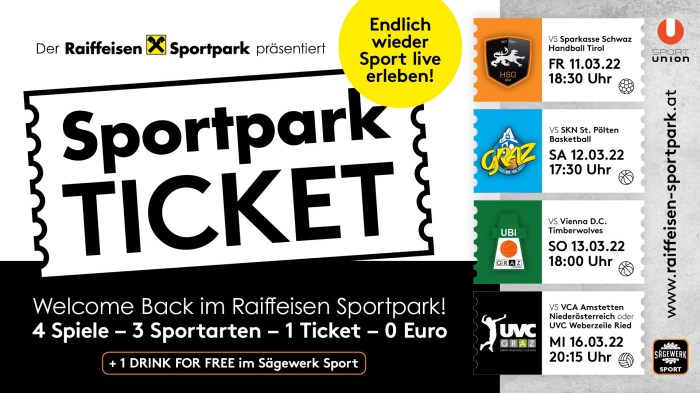 Endlich kannst du Sport in der Halle wieder LIVE erleben – mit dem SPORTPARK TICKET bekommst du VIER SPIELE aus DREI SPORTPARTEN in EINEM TICKET – und das um 0 EURO ! Folgende Spiele kannst du mit dem SPORTPARK TICKET besuchen: Freitag, 11. März, 18:30 Uhr: HSG Holding Graz vs. Sparkasse Schwaz Handball TirolSamstag, 12. März, 17:30 Uhr: UBSC Raiffeisen Graz vs. SKN St. Pölten BasketballSonntag, 13. März, 18:00 … Weiterlesen HOL DIR JETZT DEIN SPORTPARK TICKET!